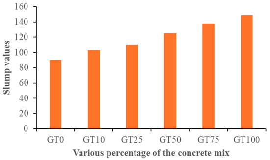The workability of concrete decreased when andesite crusher sand was replaced with SGTs. As shown in Figure 10, it was observed that when the Sika ViscoCrete 3088 superplasticizer of 0.06%, 0.078%, 0.85%, 1.23%, 1.58%, and 1.96% by weight of cement was added to the mixes GT0, GT10, GT25, GT50, GT75, and GT100, respectively, the slump values increased with the increasing SP dosage in the mixtures. This was because when the SGT proportion in the mix increased compared with the preceding mixes, the mixture became stiffer and unworkable with a lower SP dosage. Consequently, when the dosage percentage increased, the fluidity increased, making the mix workable and increasing the slump value. This might be attributed to the increase in muscovite content as the SGT proportion increased in the mixes. However, the mixes containing SGTs started to change, becoming more and more rubbery and spongy. As a result, in comparison to the reference mix, the slump values for 10%, 25%, 50%, 75%, and 100% replacement levels increased by 14%, 7%, 14%, 12%, and 18%, respectively. While the mixes gained cohesion, their increased SGT content made them stickier and consequently less manageable compared with the reference concrete. This change might have been due to the rising muscovite content with increasing SGT proportion in the concrete. Muscovite, being a clay mineral, contributes to the viscosity of the concrete mixture in its fresh state. The higher the muscovite content in the concrete, the greater is its viscosity, and subsequently, the higher the slump of the concrete [54,55,56,57].