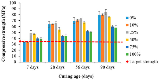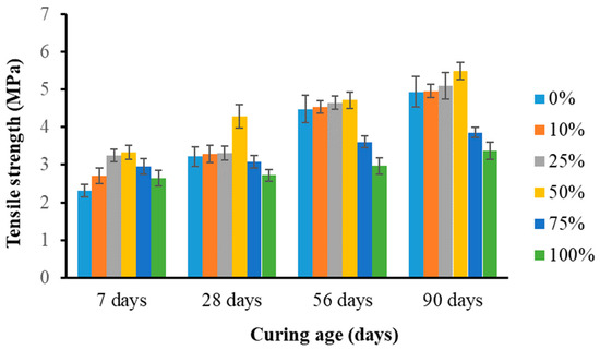 Also, the decrease in compressive strength might have been due to the higher concentration of muscovite mineral found in the SGTs, which increased as the SGT proportion in the concrete increased. The presence of muscovite particles in the concrete resulted in a smooth surface finish, causing a weaker bond between the SGTs and the cement paste [62,63]. Nevertheless, aside from the 0% and 10% replacement levels at 7 days, every concrete sample for all percentage replacement levels and curing ages achieved the target strength of 35 MPa or above.
