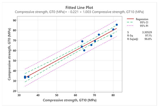 Fitted line plot showing regression analysis of compressive strength, for reference concrete against concrete made with 10% SGT.