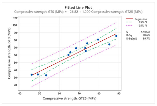 Fitted line plot showing regression analysis of compressive strength, for reference concrete against concrete made with 25% SGT.