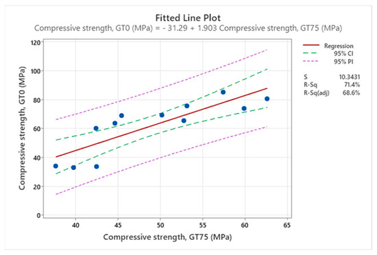 Fitted line plot showing regression analysis of compressive strength, for reference concrete against concrete made with 75% SGT.