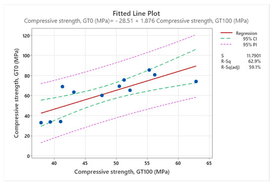 Fitted line plot showing regression analysis of compressive strength, for reference concrete against concrete made with 100% SGT.