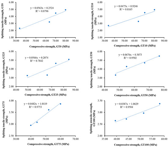 Figure 18 and Table A2 in Appendix A show the splitting tensile strength results for concrete with different proportions of andesite crusher sand replaced with SGTs, after curing periods of 7, 28, 56, and 90 days. It was observed that for each curing age, the compressive strengths increased up to a 50% substitution of crusher sand with SGTs. For GT10, GT25, and GT50, the increased percentages of splitting tensile strengths in comparison to GT0 were as follows: 17.32%, 40.69%, and 44.16% after 7 days; 2.17%, 2.80%, and 33.23% after 28 days; 1.34%, 3.79%, and 5.36% after 56 days; and 0.41%, 3.04%, and 11.13% after 90 days, respectively. The higher splitting tensile strength might have been caused by the filling effect of very fine SGT particles enhancing adhesion between aggregates and cement paste [64]. Also, the angular shape and rough surface texture of SGTs contributed to the higher splitting tensile strength by improving interlocking among aggregates in the concrete mix, thereby increasing bond strength [52]. It was noticed that for all percentage replacement levels, concrete splitting tensile strength increased with increased curing ages, indicating that the incorporation of SGTs did not impede the continuous hydration of cement within the concrete [28].