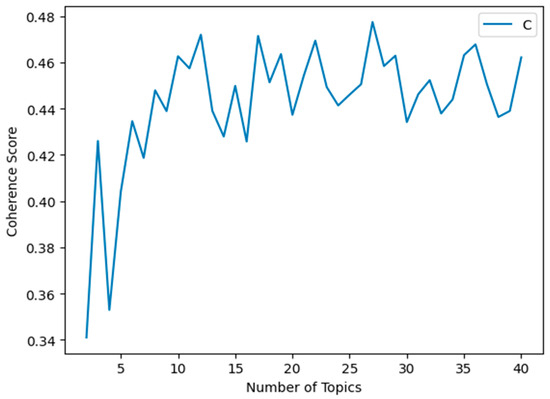 Figure 2, the coherence score initially increases and then decreases with the number of topics. A higher coherence score indicates more semantically coherent words within the topic, reflecting better interpretability and quality. Consequently, the experiment identified 27 core competency themes based on the highest point of the coherence curve. The content of the first five themes is shown in