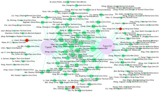 Figure 5. Among them, the hub node ‘Rahmani, Mostafa; Univ Cent Florida-USA’ (red colour) with a weighted degree centrality of 0.2 has higher community importance than the community peer ‘Tsai, Ching-Chih;Natl Chung Hsing Univ-Taiwan’ (red colour). However, scientists with outstanding professional degrees in a niche domain (Topic 6), such as ‘Li, Xiaodi; Shandong Normal Univ-China’ (weighted degree centrality = 0.23, red colour), can still be identified as important experts within the community.
