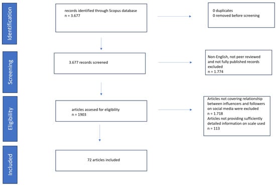 We conducted a systematic review using the Preferred Reporting Items for Systematic Reviews and Meta-Analysis (PRISMA) [42] of empirical studies that included the measurement of PSI and PSR in influencer marketing. We searched for articles in which the constructs PSI or PSR were among the variables in different models. These variables (PSI and PSR) were measured using various scales.