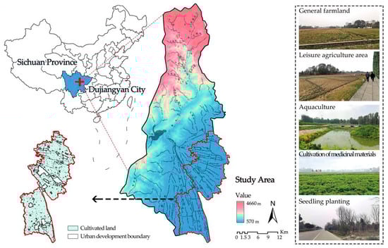 Dujiangyan city is a county-level city in Chengdu, Sichuan Province, China, named after the world-famous Dujiangyan Water Conservancy Project. The irrigation system that extends from the Dujiangyan Water Conservancy Project covers an area of more than 7100 km2, and this area has become the main grain-producing area of Sichuan, China. The research area is located at the source of the Dujiangyan Water Conservancy Project (latitude 30°44′–31°02′ N, longitude 103°0–103°47′ E) and covers an area of approximately 254 km2 (the cultivated land area is approximately 179.92 km2). The terrain in the area is flat, the slope is low, and the average altitude is approximately 600 m (Figure 1).
