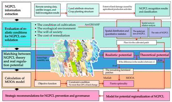 (1) To obtain a better understanding of NGPCL, remote sensing data, satellite images, and field investigation results were used. NGPCL was divided according to land attributes, the crop planting structure, and damage to cultivated land for various crop types. The NGPCL rate was subsequently calculated, the corresponding spatial pattern was analyzed, the NGPCL identification results were divided into farmland patches, and the theoretical NGPCL consolidation potential was obtained by dividing the proportion of the damage degree in farmland patches by area into 5 levels.