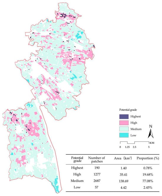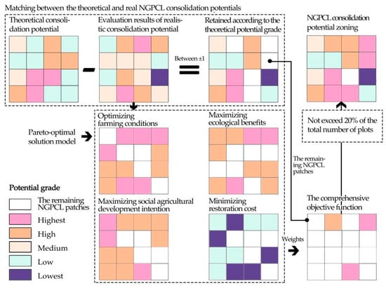 In Formula (3), pA represents the ratio of the area of a single cultivated patch (A) to that of a single NGPCL type (Ai), where i represents “Value” in the NGPCL classification. In Formula (4), Vi represents the value of the level-i theoretical consolidation potential; if pA exceeds 50%, then the original value of Ai is retained; if pA is less than 50%, the average is taken according to the pA of each Ai within the cultivated patch.