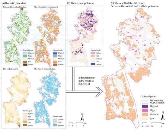 The NGPCL consolidation potential can be defined as the threshold size of the consolidation of NGPCL in a specific area into cultivated land on the basis of policy and demand [48]. On the basis of the setting of the threshold size, theoretical and realistic consolidation potentials were considered.