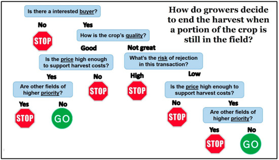 Several factors can determine whether a crop is harvested or not, and they are driven by market and environmental fluctuations, some of which can be forecasted. Growers weigh whether or not they are connected to a buyer that has an interest in purchasing the crop, the appearance and maturity of the crop in the field, the price available to them, the risk of a rejected shipment with the associated economic burden, and whether or not another crop in their purview requires attention at the same time (see Figure 2, [19]).