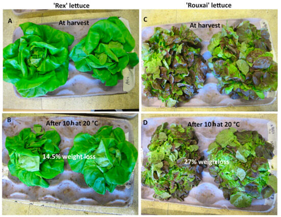 The ideal storage temperature can vary not only between different species but also among cultivars within the same species. Failure to maintain the correct storage temperature can lead to significant losses, with potential losses reaching 100% due to chilling injuries or freezing damage [31]. Additionally, maintaining the appropriate relative humidity is crucial for horticultural crops during storage and handling, given that the water content ranges from 76% to 94% across various fruits and vegetables. Any loss of water translates directly to weight loss and ultimately diminishes the economic value of the produce. In a preliminary study on two lettuce cultivars grown under controlled hydroponic system and stored after harvest at 20 °C for 10 h, the weight loss ranged from 14.5 to 27% and this variation was highly varied between the two cultivars (Figure 6).