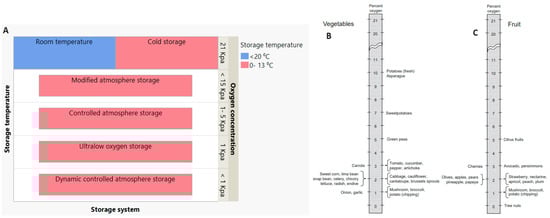 Storage systems based on storage temperature and oxygen level (A); vegetable and fruit tolerance to oxygen level in the storage (B,C). (B,C) are modified from [38].