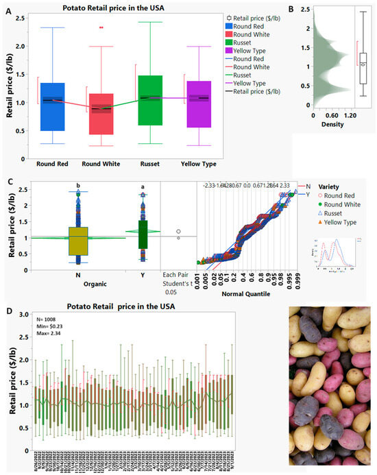 Potato retail price in the USA in 2022–2023 based on variety (A), agricultural system (B,C), and daily price (D). Modified from [41].