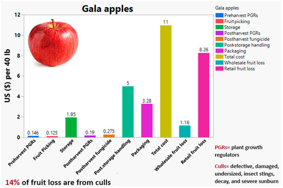 Many factors contribute to fruit loss and waste prediction models. Fruit loss from culls was about 14% in ‘Gala’ apples, and various factors affected the estimation of fruit loss, starting from the use of plant growth regulators (PGRs) to manage harvest and prevent fruit drop, to the costs associated with picking, handling, and storing the fruit. Other factors include the use of postharvest PGRs such as ethylene inhibitors, fungicides, post-storage handling, and fruit packaging (Figure 10) (personal communication with Ryan Hess, Hess Brothers’ Fruit Company, Lancaster County, PA, USA).