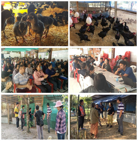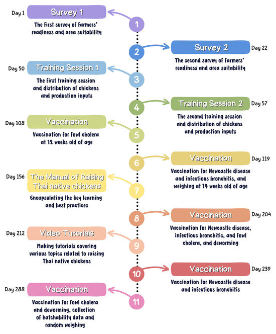 The process began with assessing the readiness and area suitability of the participants. All selected farmers attended two training sessions and received ten eight-week-old Thai native chickens (two male and eight female Pradu Hang Dum) along with other production inputs, including commercial chicken feed, deworming medicine, and vitamins. The vaccination schedule for the chickens was as follows: fowl cholera at 12 weeks of age during the fifth field visit, and Newcastle disease and infectious bronchitis at 14 weeks of age during the sixth field visit. Subsequently, according to the program, the chickens were re-vaccinated and dewormed during the eighth, tenth, and eleventh visits.