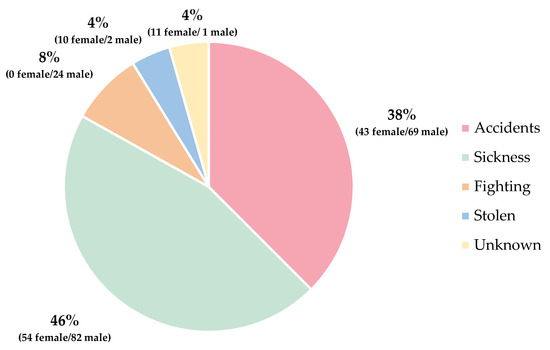 The sex-specific data reveals a notable disparity in survival, with a higher mortality rate among males (40% of survivors) compared to females (60% of survivors). A deeper examination of the specific causes of death for both male and female chickens, as presented in Figure 4, identified potential patterns or trends. Observations of the chickens’ behavior, particularly social interactions, could provide insights into the role of aggression and competition in mortality. The results revealed that male chickens had a higher mortality rate due to accidents, fighting, and sickness compared to female chickens. This disparity may be attributed to several factors, including the more aggressive and territorial nature of male chickens [34,35], which can lead to increased competition for resources and potential injuries or stress-related health issues