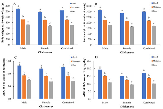 Average body weights (±SE) at 14 (A) and at 34 weeks (B), and average daily gains (ADG) at 8–14 (C) and at 14–34 (D) weeks of age in Thai native chickens by farm group (Good, Moderate, and Poor). Means for the same trait with different letters (a, b, c) differ significantly (p < 0.05).