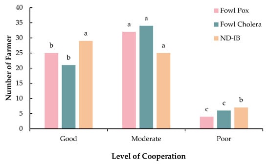 Level of cooperation and number of farmers for fowl pox, fowl cholera, and Newcastle disease and infectious bronchitis (ND-IB) vaccination separated by farm group (Good, Moderate, and Poor). Means for the same trait with different letters (a, b, c) differ significantly (p < 0.05).