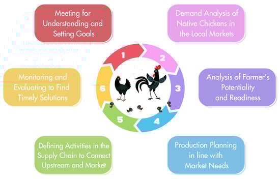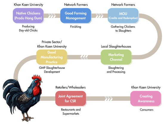 The production and distribution of Thai native chickens have undergone a transformation, transitioning from traditional practices to a more sustainable and integrated approach. It involves knowledge transfer [30] and offering guidance on native chicken production across the entire supply chain, from upstream to downstream (Figure 9). This shift involves a comprehensive understanding of the entire supply chain, starting from research centers and extending to consumers. Initially established as a research center (NCAB) which plays a pivotal role in establishing the foundation for a sustainable Thai native chicken supply chain, our research center develops high-quality breeding stock, producing high quality day-old chicks, ensuring a consistent supply of healthy breeding stock for farmers. We conducted genetic selection, focusing on selecting and breeding native chickens with desirable traits like disease resistance, good growth performance, and good meat quality. The research center also promotes best practices, disseminating knowledge and training to farmers on proper chick handling, feeding, and management techniques, ensuring optimal production and animal welfare. Participating farmers are actively guided in adopting good farming practices (GFM) aligned with the Department of Livestock Development of Thailand. This involves providing support and guidance to farmers in improving their facilities to meet GFM standards, ensuring better hygiene and animal welfare. Farmers are also encouraged to embrace sustainable farming practices, such as using organic feed, reducing waste, and minimizing environmental impact. Regular farm visits and monitoring programs are implemented to ensure compliance with GFM standards and identify any potential issues. Once chickens reach market weight, they are collected from farmer networks and transported to local slaughterhouses or Good Manufacturing Practice (GMP)-compliant slaughterhouses, ensuring higher product quality and meeting international standards. Efforts are also made to facilitate access to diverse markets, including restaurants, supermarkets, wholesalers, and major retailers, expanding the reach and sales of Thai Native chickens. Consumer awareness campaigns are promoted to highlight the benefits and unique qualities of Thai Native chickens, increasing demand and market share.