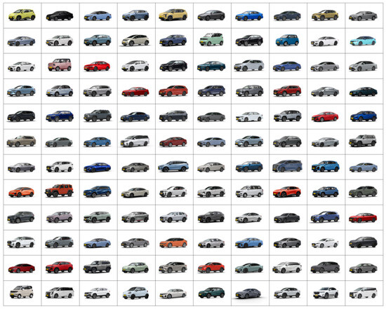 Following data collection, image samples exhibiting similar styling and low clarity were filtered out. Subsequently, two-thirds of view images were selected for testing subjects, with backgrounds removed and sizes standardized. The resulting 120 NEV styling samples were arranged in the same plane, as depicted in Figure 3.