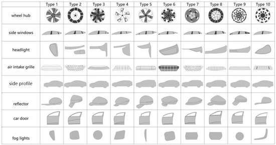 In our study, we assembled a team of five industrial designers with expertise in automotive exterior design to conduct the morphological deconstruction of 120 NEV styling samples. The deconstruction process entailed categorizing NEV components into eight distinct categories, including wheel hubs, side windows, headlights, air intake grilles, side profiles, reflectors, car doors, and fog lights. Subsequently, we identified and summarized ten different morphological features for each category (Figure 5).