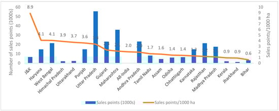 - Regions with high concentrations: Jammu and Kashmir has the highest concentration with 8.9 sales points per 1000 hectares, followed by Haryana (4.1), West Bengal (4.1), Himachal Pradesh (3.9), Punjab (3.6), and Uttar Pradesh (3.4).