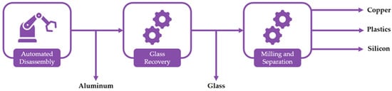 This pre-treatment was performed through the SOLAR 4.0 system []. This method allowed the recovery of the aluminum frame as well as the valuable metals. The process of glass delamination occurred through a series of special steel tools that gradually removed the glass without contaminating it with other items within the photovoltaic panel. After the glass was removed, the panel was shredded, and the materials were mechanically divided into three parts: copper, plastic, and silicon powder. Figure 2 shows the simplified scheme of the SOLAR 4.0 system.