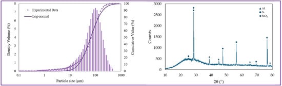 Figure 3 shows the cumulative and non-cumulative plots of particle size distribution (PSD) and the results of XRD (X’Pert PRO powder and film diffractometer) for the granulometric fraction having a diameter < 125 μm. Common PSD functions were analyzed to find the best data fit []. The Log-normal is the PSD function that describes the experimental data with the highest accuracy.