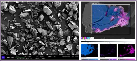 The correlation between the two elements is very low. Furthermore, as shown in Figure 12, silicon concentration in the leaching solution is very low. The silicon has a completely inert behavior to the reagents used. This result confirms that the diffusive phenomenon controlling the process is the one through the inert layer of silicon. SEM confirms this aspect: silicon represents the solid matrix, while silver is present on the surface and in some internal regions. This result is particularly interesting as it highlights the possibility of selective recovery of both elements: the silver is leached and subsequently recovered from the solution, and the silicon remains as a solid residue of the leaching process for further refinement. In this way, the proposed method allows for not only obtaining profits through the selective recovery of high-purity silver, but also having a new silicon powder to be sent for further refining processes to perhaps reach 7–9 N (99.99999–99.9999999%) purity for the fabrication of new high-efficiency silicon solar cells.