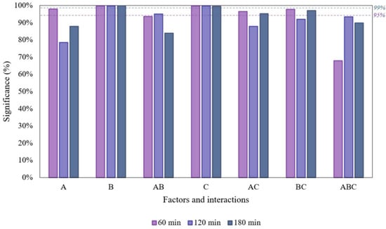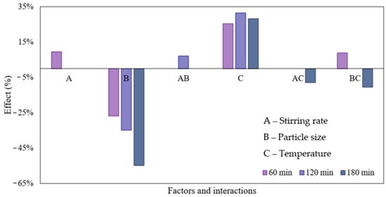 The results obtained were analyzed via ANOVA to establish the effect and significance of each factor and the related interactions on the recovery yields of the various elements. In particular, F-test was performed to determine the significance of the effects of factors and interactions throughout the reaction time. The results obtained from this analysis, in terms of significance and effects plots [], are reported below (Figure 5 and Figure 6).