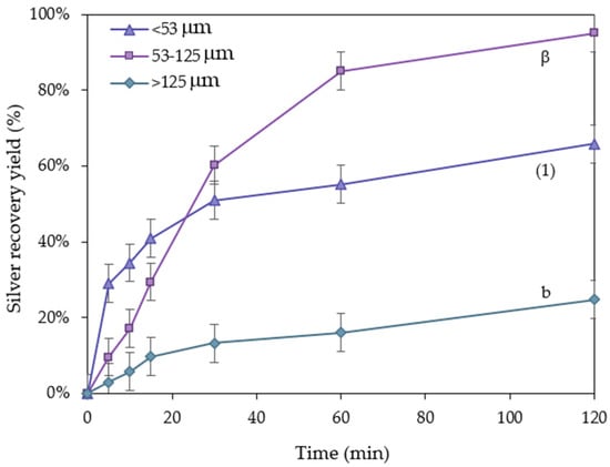 Silver recovery yield for different particle size fractions (temperature: 25 °C, stirring rate: 60 rpm).