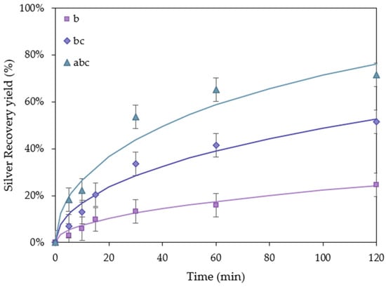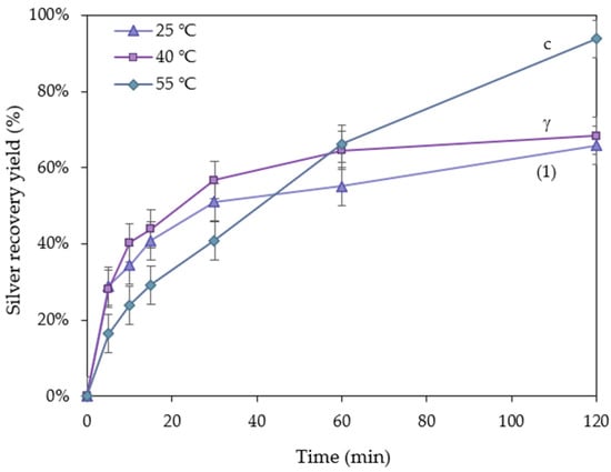 Regarding the effect of temperature, it can be seen from Figure 8 that it is less significant than that of particle size. The silver recovery yield for low temperatures (25 °C) increases gradually, reaching about 60% after 120 min of reaction. With a temperature of 40 °C, the silver recovery yield rises rapidly in the first 40 min, reaching even 50% recovery yield; subsequently, the increase is more gradual and reaches about 70% yield after 120 min from the start of the test. Finally, for a temperature of 55 °C, the silver recovery yield increases rapidly in the first 40 min, reaching about 65%. This increase continues steadily until reaching about 90% yield after 120 min.