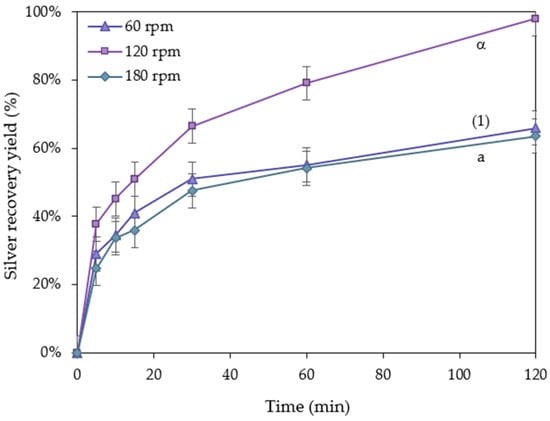 As for the effect of stirring rate, it is seen that it is more significant than temperature and less significant than particle size. The silver recovery yield increases gradually in the 60 rpm test, reaching about 60% after 120 min. The silver recovery yield for the 120 rpm test rises rapidly in the first 30 min, reaching about 50%. Subsequently, the increase continues until the yield reaches 90% after 120 min. In the case of the 180 rpm test, there is a very rapid increase in the silver recovery yield in the first 20 min until reaching the value of 40%. Subsequently, the growth is more gradual, reaching about 60% after 120 min, similar to the trend at 60 rpm.