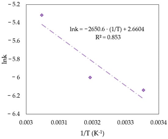 Figure 11 shows the graph for estimating the Arrhenius parameters, constructed using the kinetic constants.