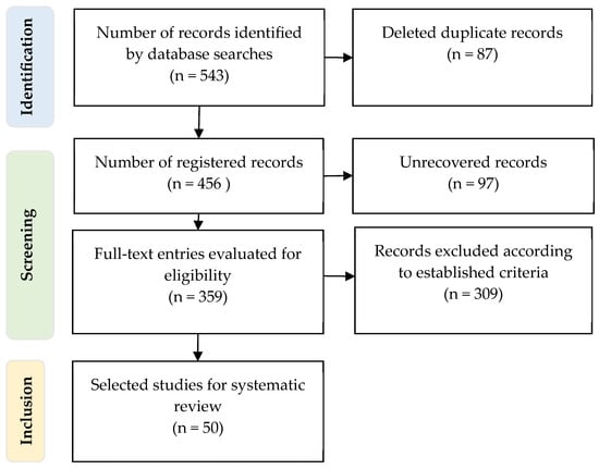 As for the identification phase of the PRISMA methodology in which the most relevant studies were selected, a total of 543 records were obtained, of which 87 documents presented duplicate information, and were continued to be discarded. In the second phase called screening, the titles and summaries of each of the studies were analyzed to determine whether they met the previously established inclusion and exclusion criteria. Based on this, it was determined that 97 documents did not meet the availability criterion; therefore, a total of 359 documents were obtained as available for a second screening phase where each of them was re-analyzed in a thorough manner, resulting in 309 studies not being part of the inclusion criteria and therefore being deleted. Finally, 50 items were identified that met the inclusion criteria and would be part of the systematic review. The use of these specific platforms can introduce a selection bias, as each may vary in terms of thematic coverage, geographic focus and full text availability. To avoid possible biases, Boolean logic as previously described was used, ensuring a broad and balanced review of the literature (Figure 1).