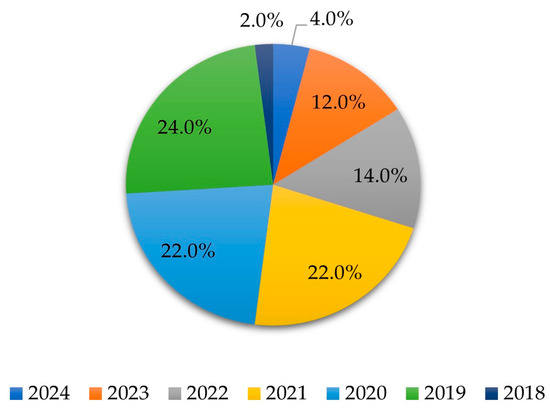 The articles reviewed were published between 2019 and 2024. The year with the highest number of studies included in the search was 2019, comprising approximately 24% of the total number of documents in this research; on the other hand, the year with the lowest percentage of publications was 2018, of 2%, as shown in Figure 2.