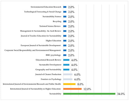 The articles were published in various journals related to the research topic, such as the following: Sustainability, International Journal of Sustainability in Higher Education, Journal of Cleaner Production, Geography and Sustainability, Sustainability Science, Corporate Social Responsibility and Environmental Management, Sustainable Development, Technological Forecasting and Social Change, National Science Review, European Journal of Sustainable Development and Frontiers in Psychology, among others. Of these, 34% of the articles were published in the journal Sustainability, 12% in the International Journal of Sustainability in Higher Education and 8% in the International Journal of Environmental Research and Public Health, as shown in Figure 3.