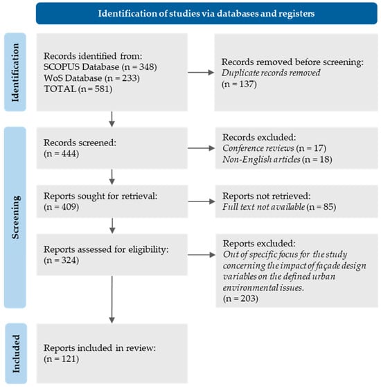 First, 35 conference reviews and non-English articles were excluded. Then, of the 409 reports sought for retrieval, 85 documents were not available, resulting in 324 full reports to be assessed for eligibility, within the boundaries defined for the literature review. These reports were carefully checked to see if they met the required criterion to answer the research questions, namely, assessing if the specific focus of the studies explicitly addressed direct impacts of façade design on each defined environmental issue at the local scale. The use of this criterion meant that articles that reported on (i) indoor impacts of façade design, (ii) urban or territorial scale strategies to deal with environmental issues, or (iii) general statements regarding the defined topics were excluded. Similarly, we also excluded articles that explored (iv) potential indirect impacts of building design on the defined environmental issues, striving for focused studies on explicit direct reported impacts.