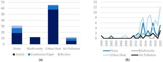 Figure 2a shows the number and type of articles considered in the review per urban environmental issue, as a result of the systematic screening process. Out of the 121 articles that responded to the defined criteria, 66 address the role of the building envelope regarding urban heat, 31 noise issues, 12 air pollution, and 12 the lack of biodiversity. Based on the number of matches, it is evident that the relation between the building envelope and the heat and noise urban environmental domains has been more studied, in comparison to the impact of the building envelope on air pollution and biodiversity, which remains largely incipient. This statement is reinforced by Figure 2b, which shows the number of articles per year. The graph shows that almost all articles considered in the review were published in the last decade, serving as testimony to the relative novelty of the general focus. Nonetheless, studies about the impact of façades on biodiversity and air pollution have remained scattered, while there has been a clear increasing research output concerning noise and urban heat issues, particularly in the latter.