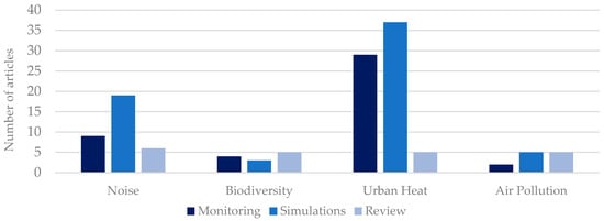 To frame the scope of the literature review, it was decided to focus on four urban environmental issues, widely accepted as serious challenges that currently besiege urban areas: (i) urban heat, (ii) air pollution, (iii) noise pollution, and (iv) biodiversity loss.