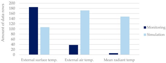 The resulting database consisted of 656 data rows extracted from 36 articles out of the 66 initially selected for the review. The database comprises three distinct indicators used in the studies to assess the impact of the façade interventions on the thermal environment: External Surface Temperatures (ESTs), External Air Temperatures (EATs), and Mean Radiant Temperatures (MRTs). Most results referred to changes in the EST with 292 data points, followed by the EAT and the MRT with 210 and 154, respectively. These results were obtained either through monitoring real cases and experiments via sensors or through dynamic simulations via specialized software, as shown in Figure 5. The graph shows that the results for each indicator are highly dependent on the available methods, particularly in the cases of the EAT and the MRT, since it is harder to achieve consistent results on those indicators via monitoring due to contextual variables and the complexity of the sensing equipment on longer monitoring campaigns, especially in the case of MRT measurements.