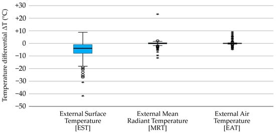 A first glance at the results (Figure 6) shows that expectedly, the impact on the EST is more noticeable, achieving a temperature differential as high as −40 °C, with a median of 5.6 °C less than the base case scenario for each. The impact on the surface temperature was expected to be the highest out of the reported indicators, especially following the direct impact of incident solar radiation on façade materials with varying indices of heat conductivity and absorption. In turn, the heat accumulated and dissipated in these surfaces elevates the temperatures in their immediate surroundings, although with a lower relative impact compared to the EST. Hence, the decrease in the external air temperature (EAT) reported in the reviewed articles reaches a maximum of −4.9 °C in the local proximity of the evaluated façades; and this number increases up to −11.6 °C for the reported MRT values, evidencing a higher role of the surrounding surfaces’ temperatures, which are shown to be higher compared to the EAT. For both the EAT and the MRT, the reported medians are close to 0 °C, which points out the limitations of the expected effect that building surfaces could enforce on their thermal surroundings. Even though beneficial impacts are reported, these must be actively sought by the cautious application of design strategies following a careful consideration of local parameters.