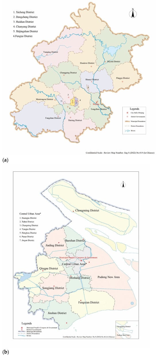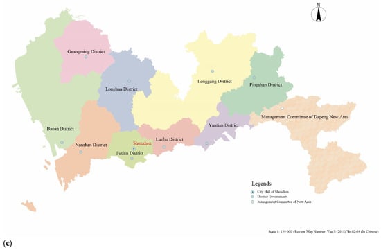 District Maps of Beijing, Shanghai, and Shenzhen. (a) Administrative divisions of Beijing (Source: Beijing Municipal Commission of Planning and Natural Resources). (b) Administrative divisions of Shanghai (Source: Shanghai Surveying and Mapping Institute). (c) Administrative divisions of Shenzhen (Source: Shenzhen Planning and Natural Resources Bureau).