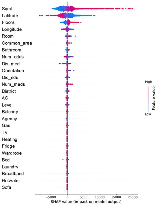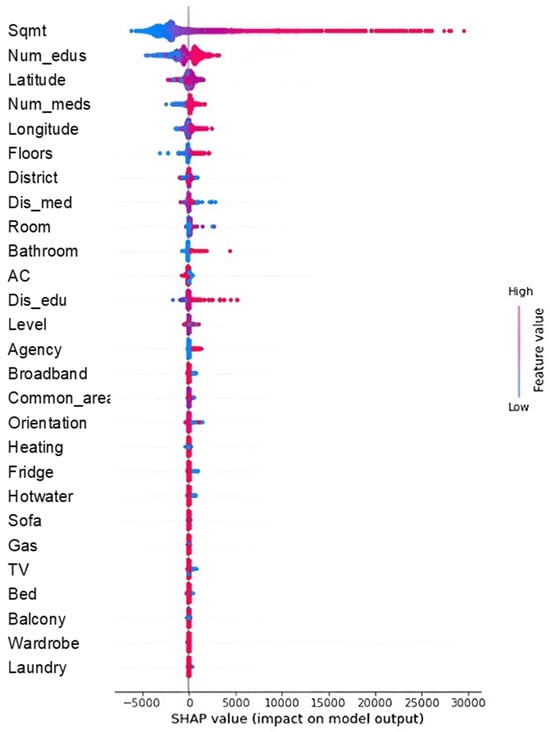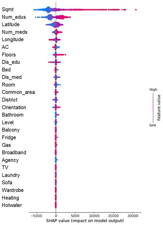 Figure 2 shows the SHAP summary plot for the developed model of rentals in Beijing. Sqmt (size) turns out to be the most influential variable on price, followed by Num_edus (number of educational institutions within 3 km of the property), latitude, Num_meds (number of medical/healthcare facilities within 3 km of the property), and longitude which are the other four important variables.