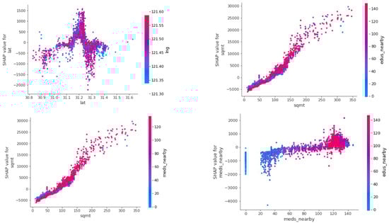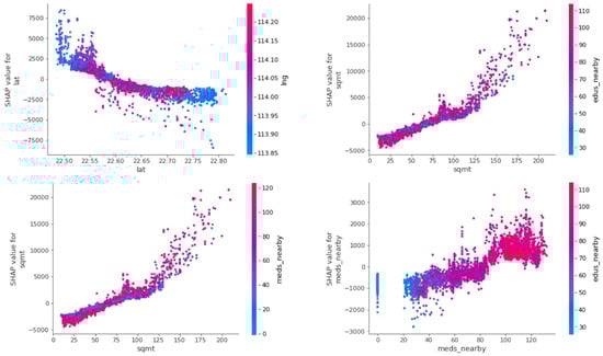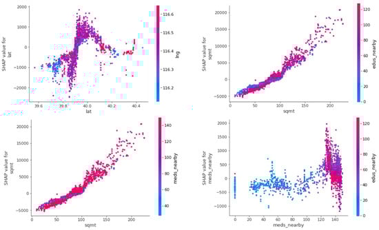 Figure 3 shows the SHAP interaction plots of latitude and longitude, Sqmt and number of educational institutions, Sqmt and number of medical facilities, and number of educational institutions and number of medical facilities. Two features, longitude and latitude, together define the geographical location of a property. According to the result of Figure 3, rental prices are higher in areas within latitude (39.95, 40.00) and longitude (116.30, 116.42). This result corresponds to the four districts of Xicheng, Dongcheng, Chaoyang, and Haidian, which are all located in the central urban area of Beijing [42]. This suggests that the results suggested by the model developed in this study match well with reality.