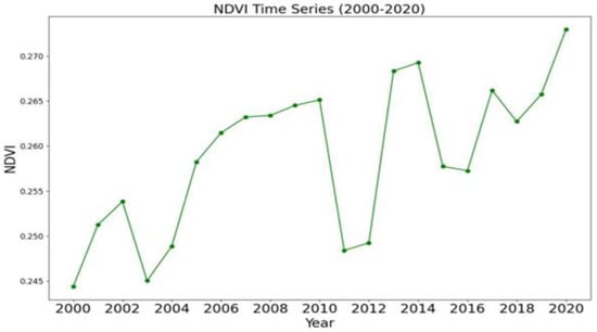 In recent decades, remote sensing data have been considered as primary sources of vegetation detection. In this research, some of these techniques were used to detect vegetation change in the National Botanical Garden in Khartoum for a specific period from 2000 to 2020, which is the normalized difference vegetation index (NDVI). The aim of the analysis was to analyze the nature of the changes in the vegetation cover of the garden during the specific time (see Figure 3, Figure 4 and Figure 5). The analysis was based on annual NDVI data from the Google Earth Engine (GEE), which was calculated using a Moderate Resolution Imaging Spectroradiometer (MODIS). This chart was drawn using Python code, and the calculation formula is: