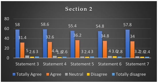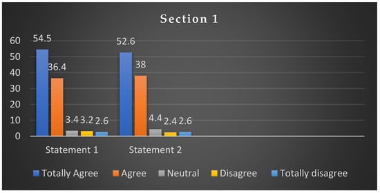 The first section included two statements (see Table 8). Figure 12: Statement (1)—the total area was very small compared to botanical gardens, and, together, these percentages demonstrate a significant majority of participants acknowledging the small size of the garden in comparison to others, indicating that the prevailing perception among participants is one of agreement regarding the garden’s relatively limited area. Figure 1: Statement (2) suggests a proposition to retain the National Botanical Garden (NBG) as a historical garden while simultaneously creating a new garden with a larger area. These percentages represent a significant majority of participants supporting the idea of maintaining the NBG as a historical garden, while also creating a new, larger garden (see Figure 1).