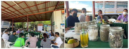 Samut Songkhram Province used to be number one in sea salt production but has now fallen to number three in Thailand, where sea salt farms have significantly decreased in this area. The Samut Songkhram Provincial Sea Salt Confederation is a group representing the leading salt farmers in Samut Songkhram Province. They are considered the owners of the salt fields, experts in salt farming, and direct stakeholders in the sea salt business. Therefore, this research was conducted in a focus group with government agencies, community leaders, village headmen, farmers, the Samut Songkhram Provincial Sea Salt Confederation, and teachers’ representatives in the sea salt field area, Bang Kaeo Subdistrict, Samut Songkhram Province, Thailand, as shown in Figure 2. This focus group focuses on collecting information, content moderation, and the order of telling the story of sea salt farming to develop virtual reality media into a suitable medium for disseminating information. By creating an experience by presenting fresh and fun content, AVL simulates the user’s senses, including seeing, touching, and hearing, better than disseminating information using written and audio–visual media displayed on the screen, although these methods may have been considered appropriate in the past.