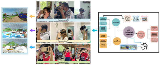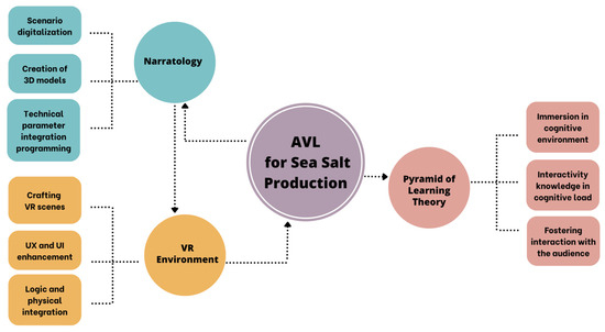 According to Figure 4 and the above discussion, these three principles are integrated into the AVL framework to create a comprehensive learning experience. Narratology provides the narrative context and storytelling, the pyramid of learning serves as a guide for structuring the educational content of knowledge to ensure that learners build a strong foundation before moving onto more advanced topics, and the VR environment offers an immersive platform for learning in the digital space where learners can interact with educational content in a simulated, often 3D, environment. Therefore, the overall knowledge content is arranged as a story of salt production based on narratology in an immersive learning format in a VR environment, with the complexity of the content from easy to difficult, in the order of the steps of the pyramid of learning. Together, they make education affordable, highly effective, engaging, and accessible to a broader audience. This approach can be precious in distance education, professional training, and any context where traditional learning methods may be limited by resources or accessibility.